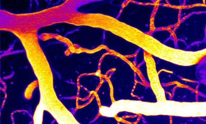 تم تصوير الأوعية الدموية الدقيقة في الدماغ باستخدام مجهر المسح بالليزر ثنائي الفوتون. المصدر: آسر بدير، دكتوراه، كلية لارنر للطب