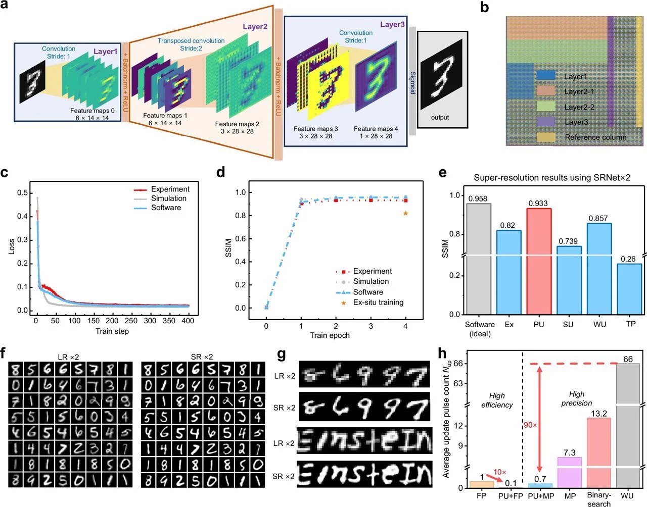 وأكد الاختبار نتائج مبهرة. قام الباحثون بتدريب الشبكات العصبية على إزالة التشويش من الصور وزيادة دقتها، وذلك باستخدام مصفوفة ذاكرات مصممة خصيصًا بحجم 180 نانومتر. وكانت مؤشرات التشابه الهيكلي التي تم الحصول عليها (SSIM) 0.896 و 0.933 على التوالي، وهي نتائج مماثلة للطرق التقليدية.