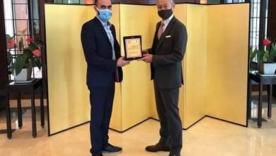 سلم الاعلامي زاريه باريكيان سفير اليابان في لبنان أوكوبو تاكيشي درعا تقديريا للتبرعات التي قدمتها اليابان للبنان بعد انفجار مرفأ…